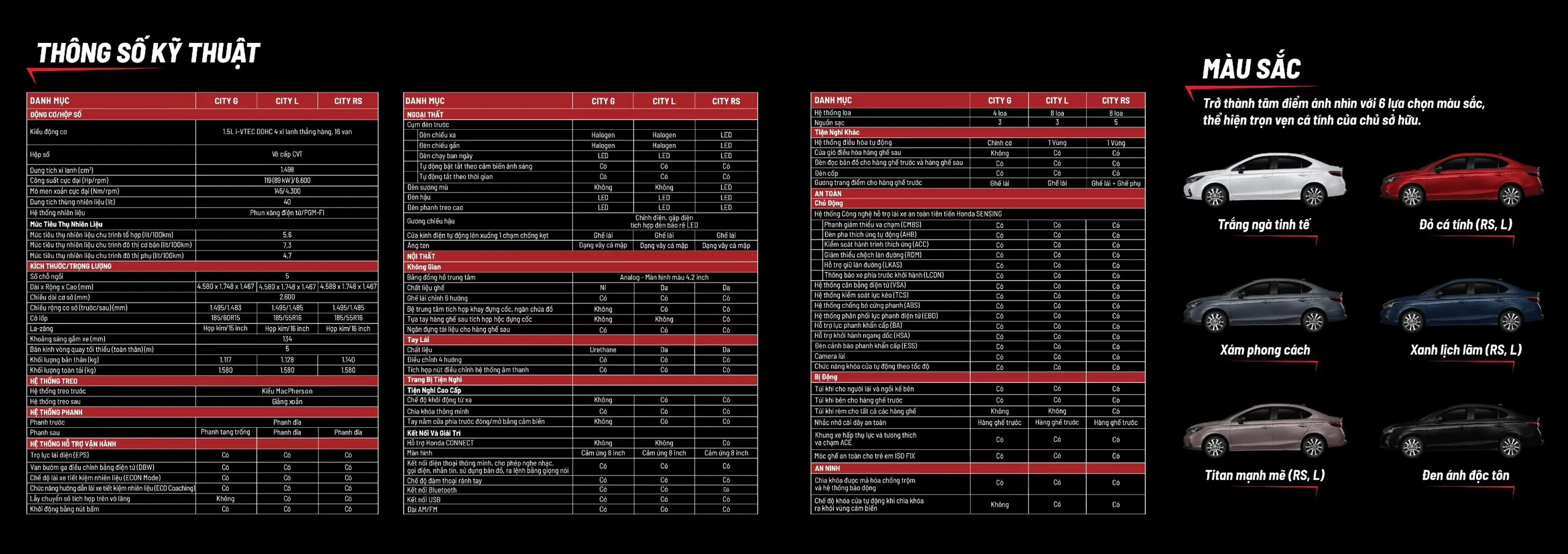 Honda City mới gồm ba phiên bản (RS, L, G) cùng 6 màu ngoại thất được lắp ráp, phân phối chính hãng tại Việt Nam